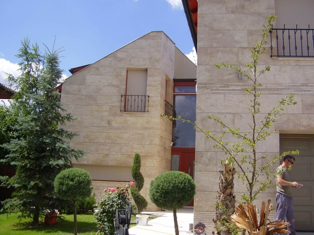 Acélkapcsokkal, sínekkel rögzített homlokzati szerelt (átszellőztetett) természetes kőburkolat kivitelezése, ragasztott (speciálisan rögzített hőszigetelésre is) homlokzati kőburkolat készítése.